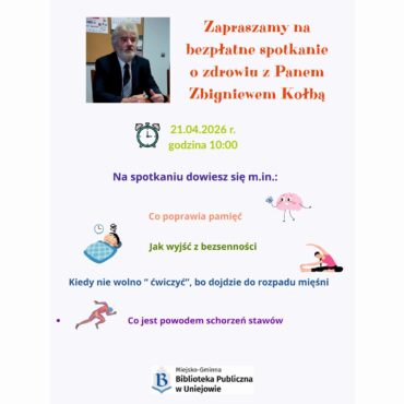 W Miejsko-Gminnej Bibliotece Publicznej w Uniejowie 21 kwietnia 2026 roku o godz. 10:00 odbędzie się bezpłatne spotkanie poświęcone zdrowiu. Gościem wydarzenia będzie Pan Zbigniew Kołba – ekspert, który w przystępny sposób opowie o tym, jak dbać o swoje ciało i umysł na co dzień.