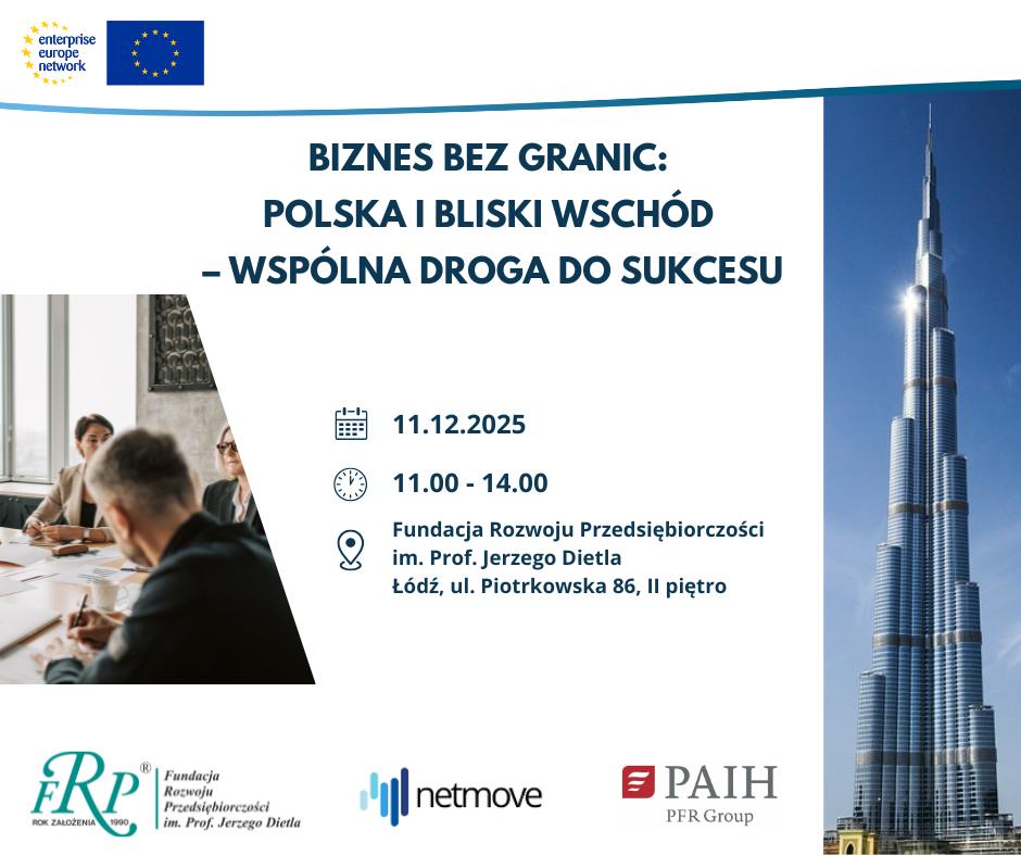 Fundacja Rozwoju Przedsiębiorczości im. Prof. Jerzego Dietla zaprasza na konferencję „Biznes bez granic: Polska i Bliski Wschód”, która odbędzie się 11 grudnia 2025 r. w godz. 11:00–14:00 w siedzibie Fundacji przy ul. Piotrkowskiej 86 w Łodzi.