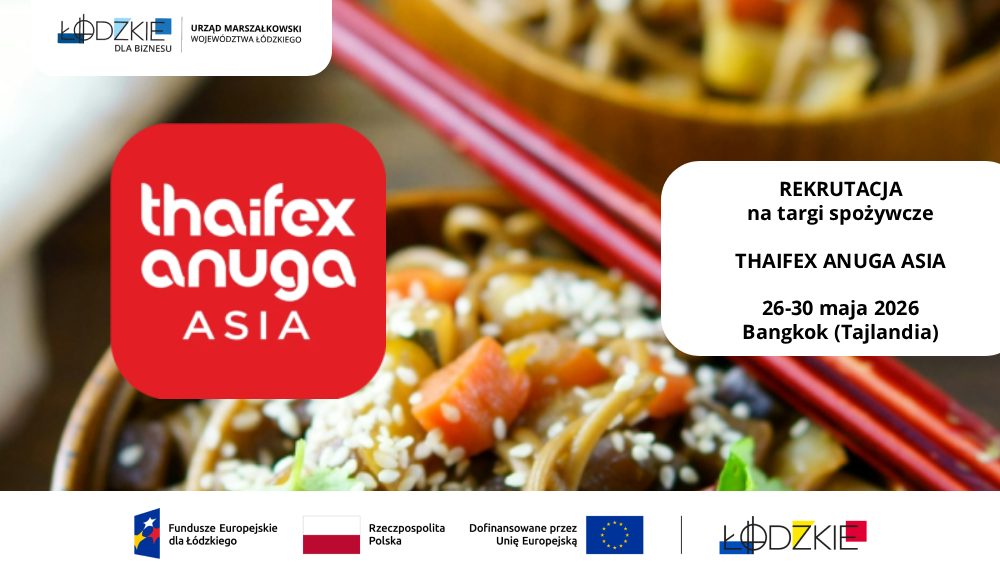 Przedsiębiorcy z sektora MŚP działający w branży spożywczej w województwie łódzkim mają wyjątkową okazję do rozwoju swojej działalności na rynkach międzynarodowych. Województwo Łódzkie zaprasza do udziału w prestiżowych targach THAIFEX – ANUGA ASIA 2026, które odbędą się w dniach 26–30 maja 2026 r. w Bangkoku, w Tajlandii.