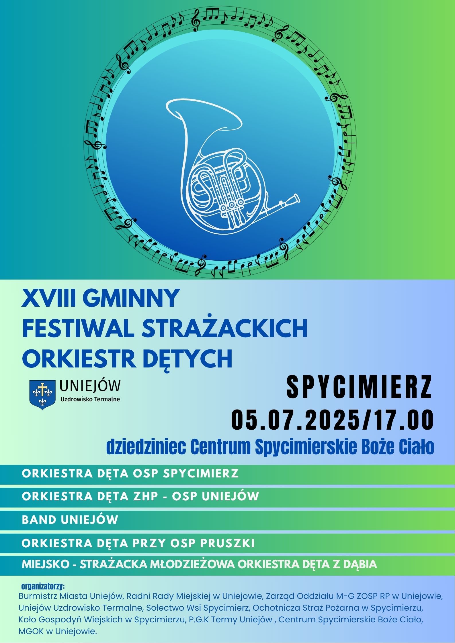 5 lipca 2025 r. o godzinie 17.00 na terenie Centrum w Spycimierzu odbędzie się XVIII edycja Gminnego Festiwalu Strażackich Orkiestr Dętych. Wystąpi pięć fantastycznych orkiestr, gwarantując niezapomniane muzyczne doznania i świetną zabawę.